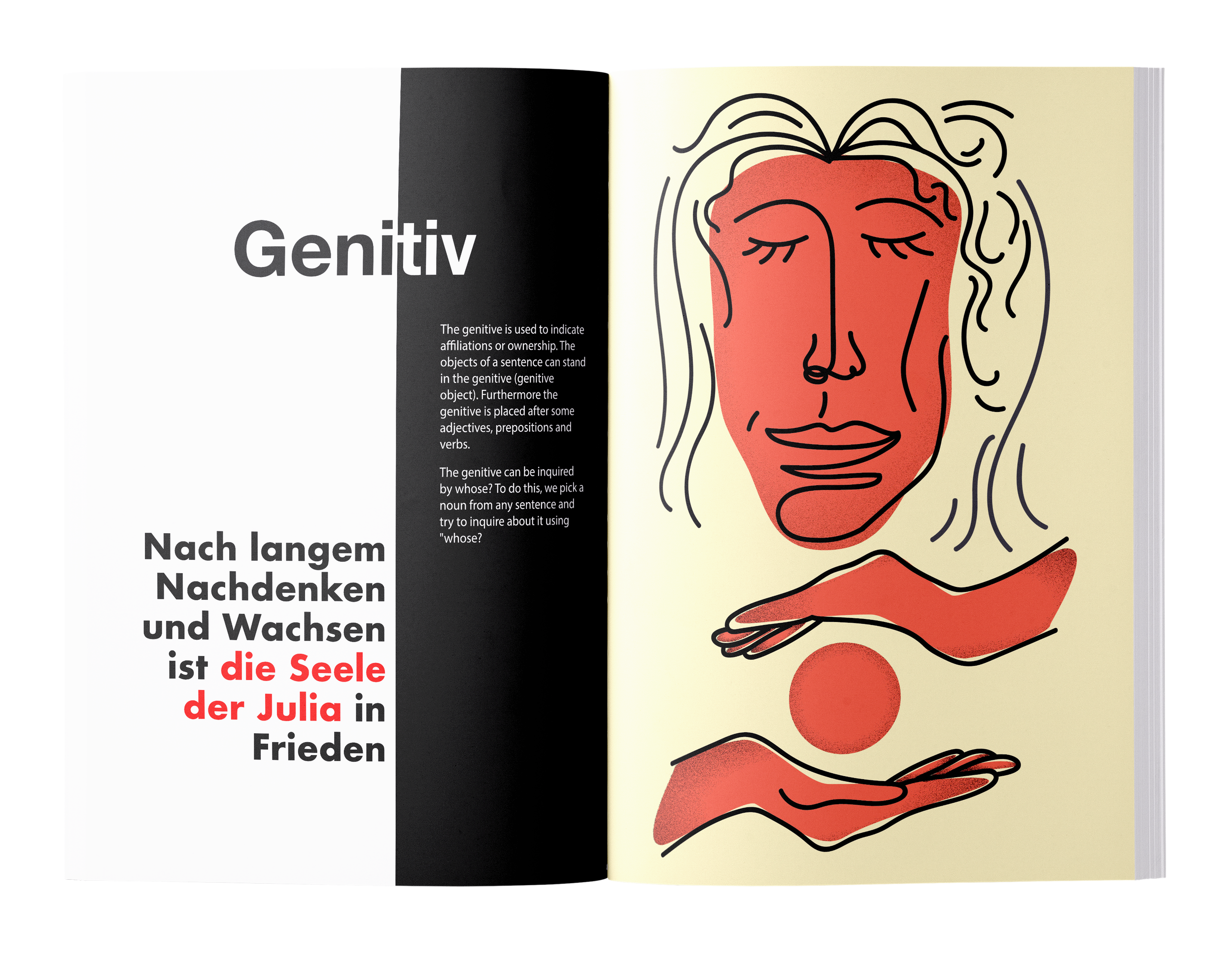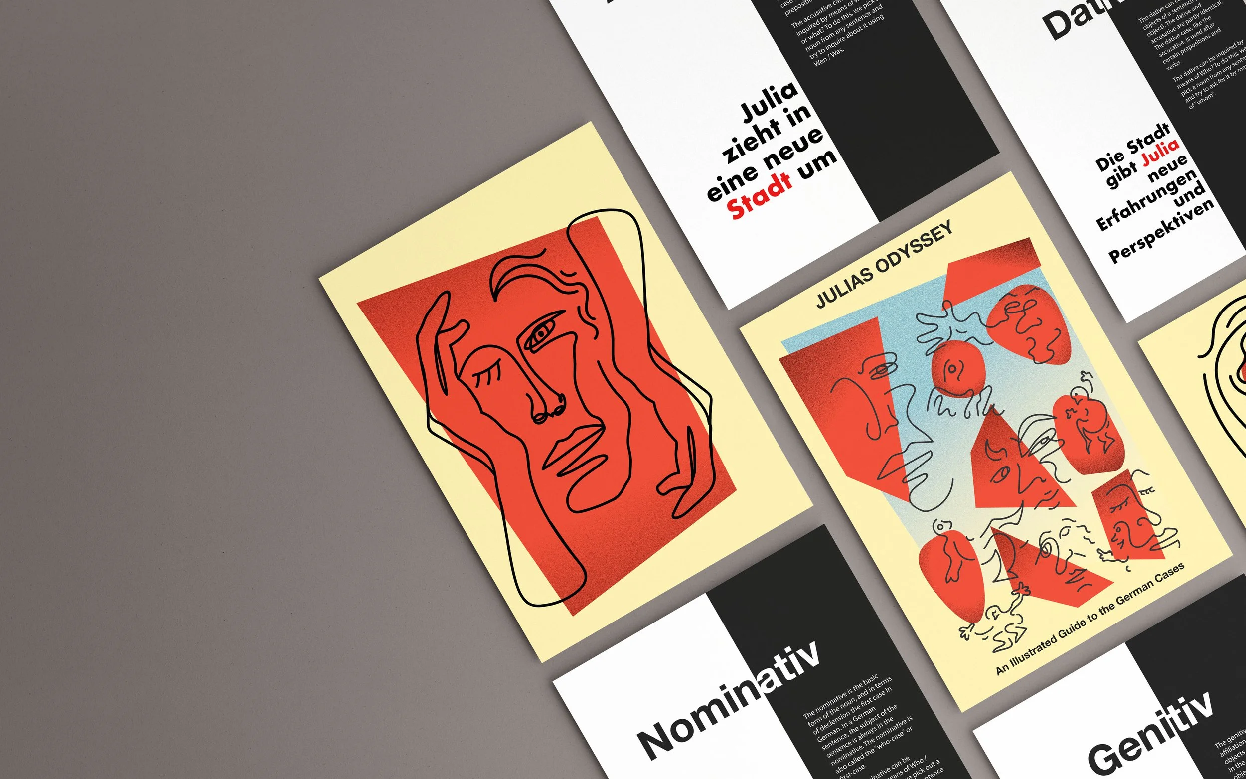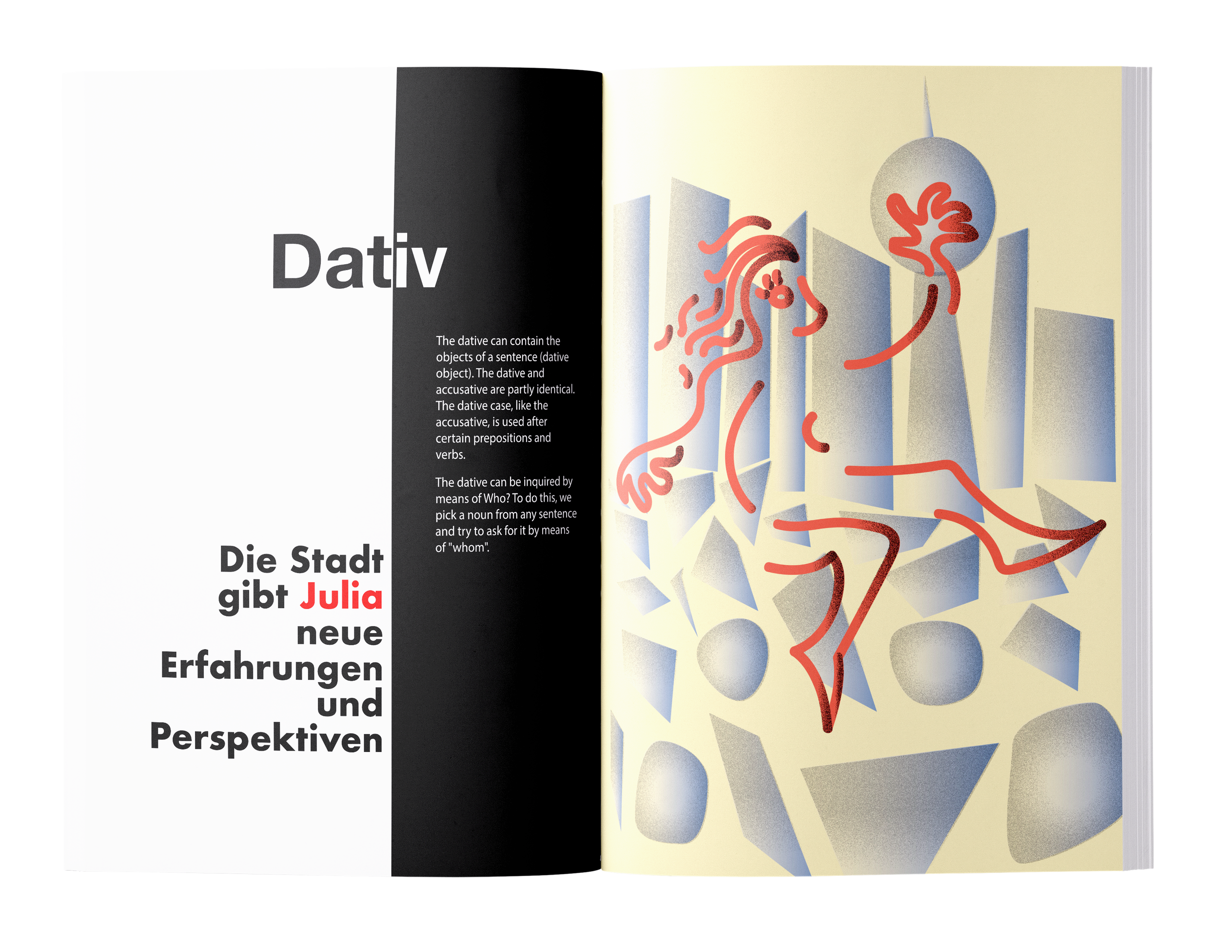 An illustrated short handbook explaining the German cases, a grammatical concept dictating pronouns based on subject, ownership and indirect objects of a sentence. All illustrations, layout and text done by me.